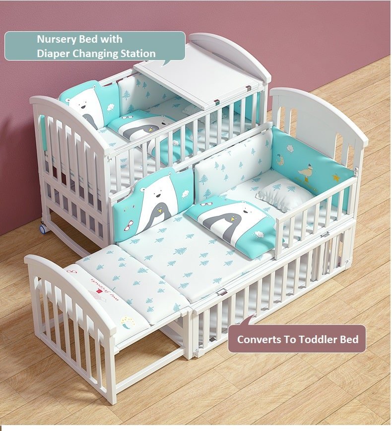 BabyTeddy® Exclusive Limited Edition 12 in 1 Patented Convertible Panda Penguin Baby Crib Wooden Cot Bed Swing Desk with 6 Piece Bedding Set,Mosquito Net and Diaper Changing Station (Blue)