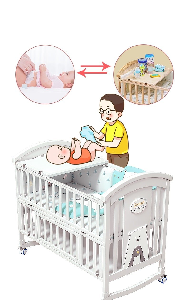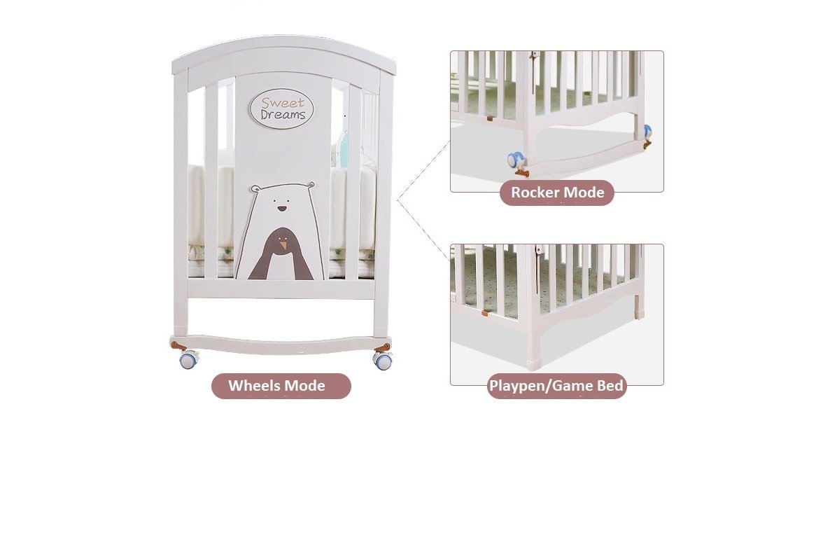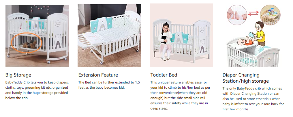 - Its soft rocking function is scientifically designed and requires just your gentle touch which makes baby feel like it’s in mom’s arms and dozes off to sleep hassle free. So now forget using age old method of putting baby to sleep on lap which almost takes all of new mom’s energy. BabyTeddy Crib lets you to keep diapers, cloths, toys, grooming kit etc. organized and handy in the huge storage provided below the crib.