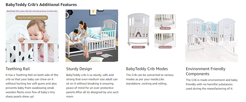 - It has a Teething Rail on both side of the crib so that your baby can chew on it without hurting her soft gums and also prevents baby from swallowing small wooden flecks once few of baby’s tiny sharp pearls show up!. The BabyTeddy crib can also be used as playpen for your naughty ninja while you can relax worry free.