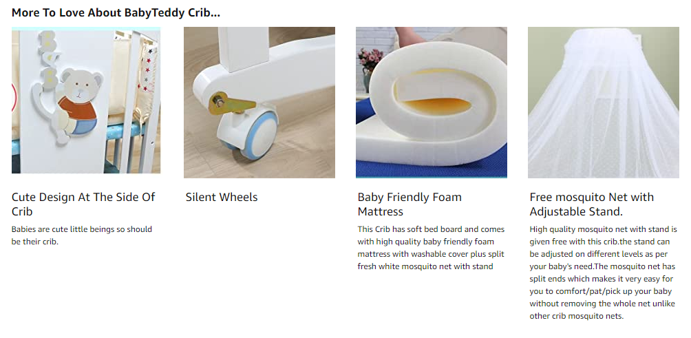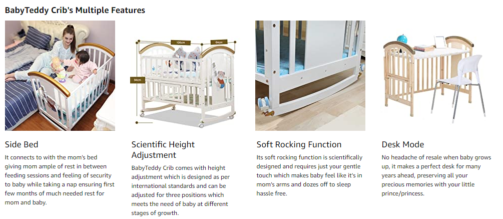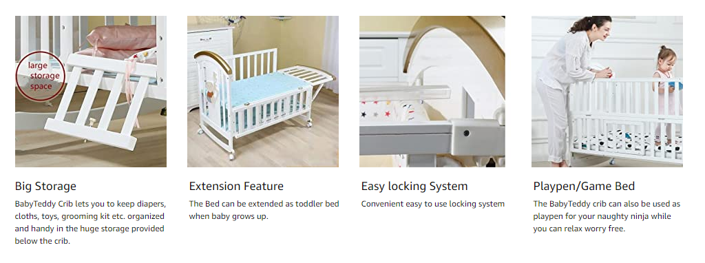 - Its soft rocking function is scientifically designed and requires just your gentle touch which makes baby feel like it’s in mom’s arms and dozes off to sleep hassle free. So now forget using age old method of putting baby to sleep on lap which almost takes all of new mom’s energy. BabyTeddy Crib lets you to keep diapers, cloths, toys, grooming kit etc. organized and handy in the huge storage provided below the crib.