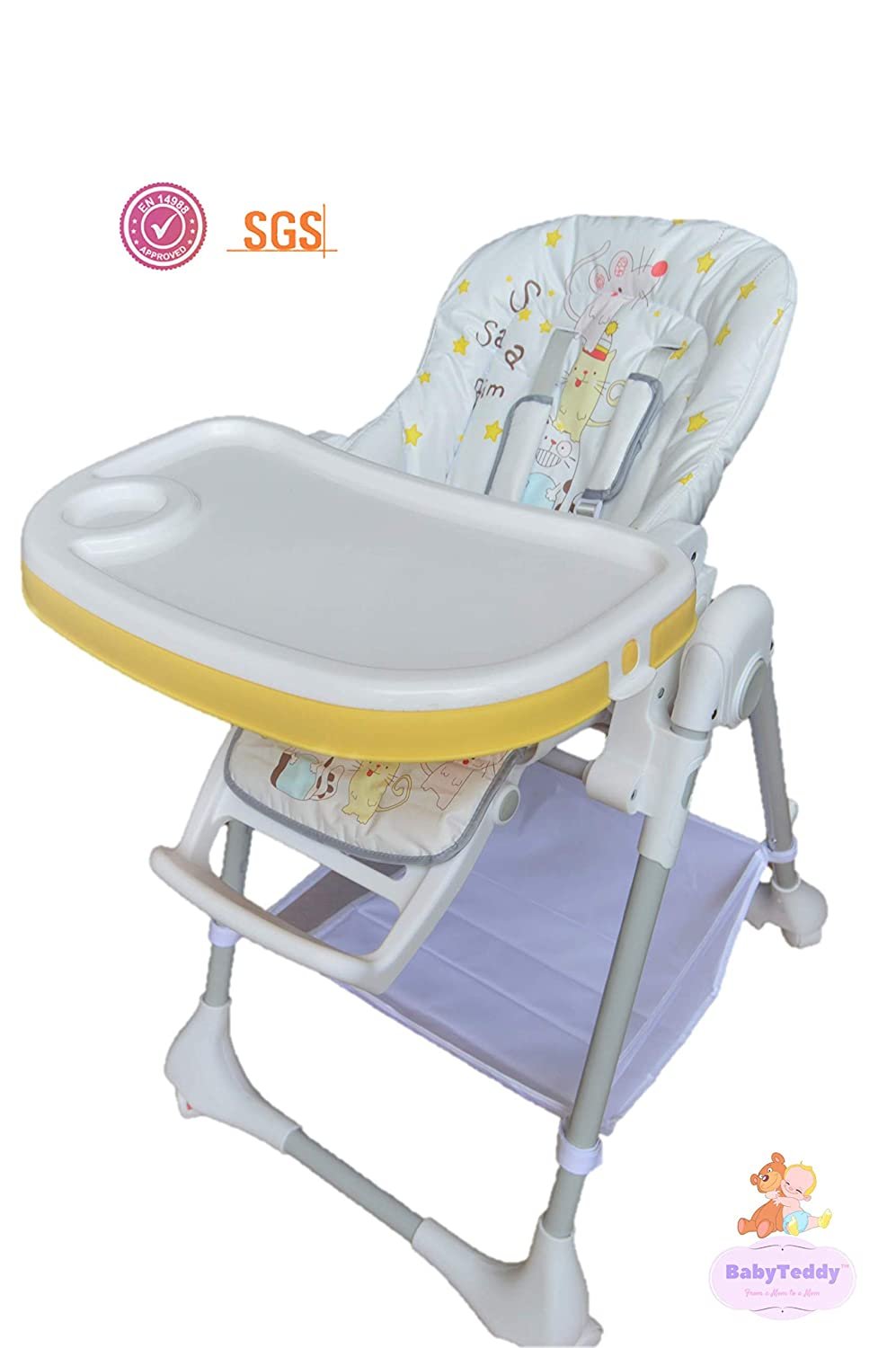 - BabyTeddy High chair is EN and SGS certified and is loaded with amazing adjustable settings to suit baby’s each growing up stage – Its 5- reclining positions with combination of 5-foot rest positions and 8 different height settings gives you freedom to decide your buds comfort and adapt to mealtime posture as your baby grows from newborn to 4 years.